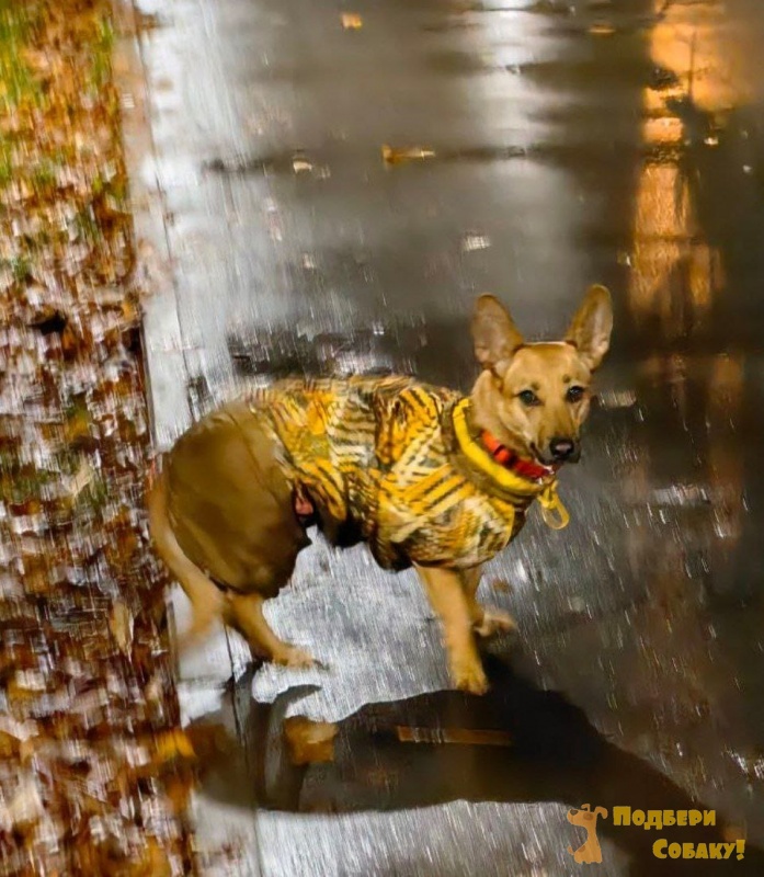 В рыже-желтом комбинезоне (на фото.) На шее адресник.