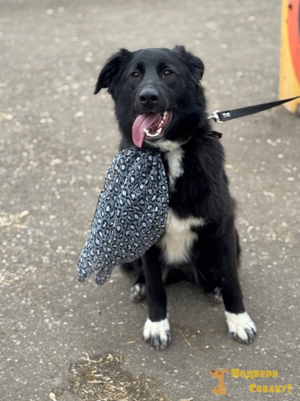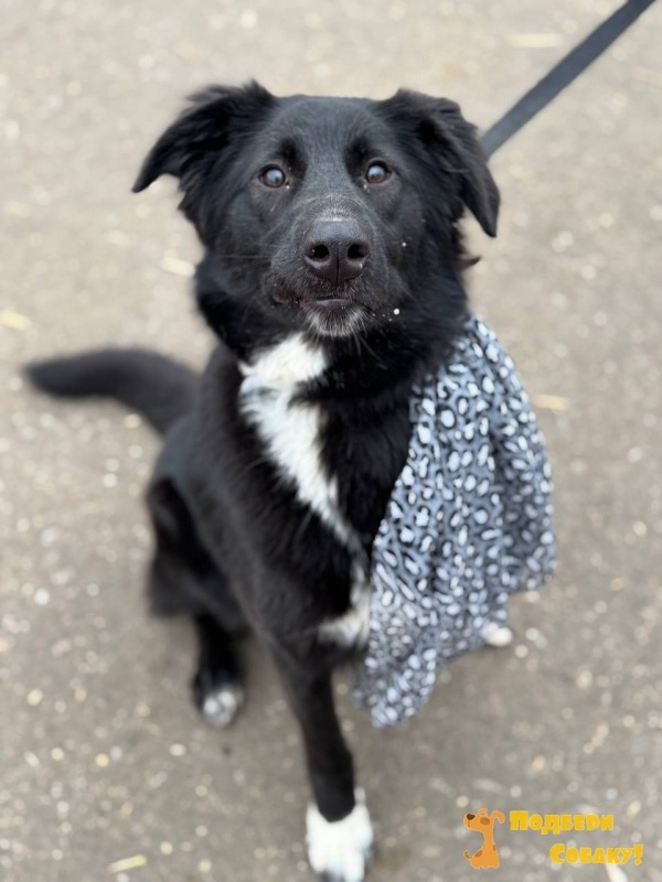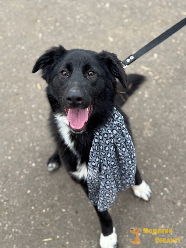 Её шерсть насыщенного чёрного цвета с белыми отметинами на лапах и груди, что придаёт ей особую выразительность.
