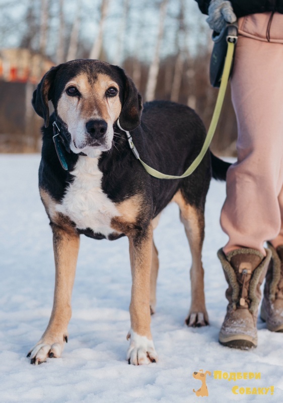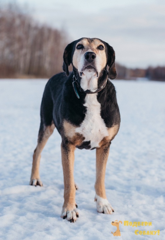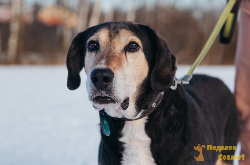 Даня. Это очень спокойный, уравновешенный парень когда то точно был домашним. Он семейная собака!