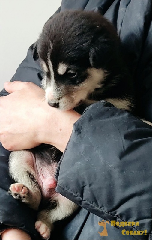 Мама - восточно-сибирская лайка, папа - на 1/4 лайка или хаски. Черный мальчик с белой полоской на мордочке и белыми бровками и брюшком, на груди белое колечко. Любопытный, спокойный, ласковый, игривый, активный.