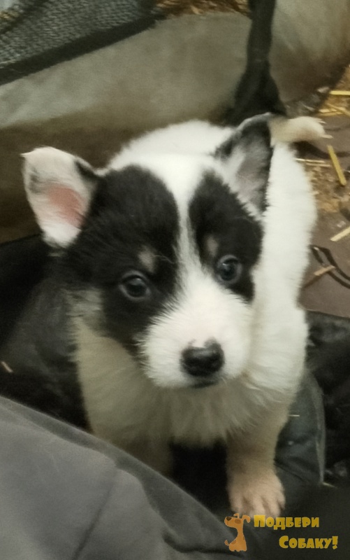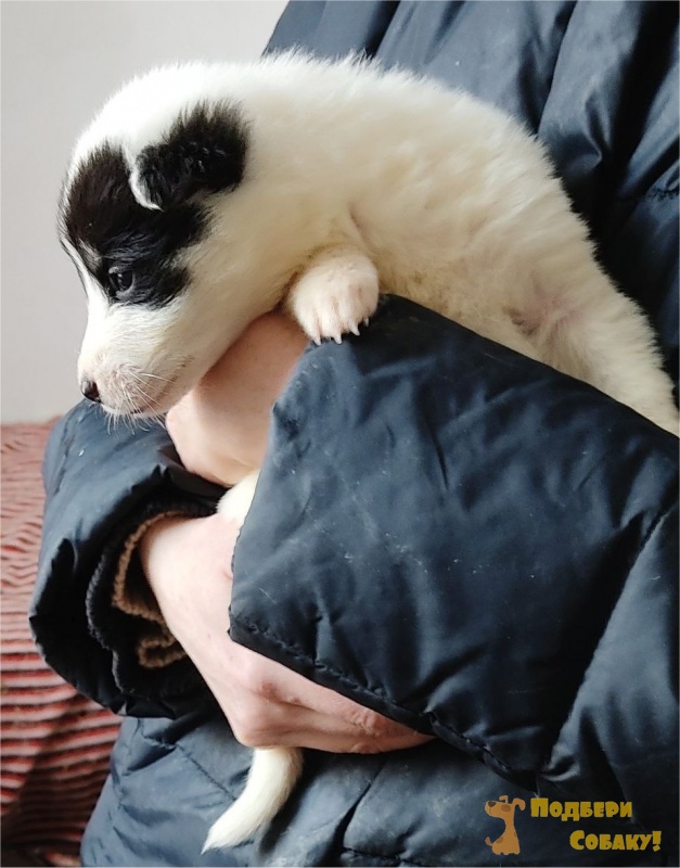 Метис восточно-сибирской лайки, папа - на 1/4 лайка или хаски. Белый мальчик с черными пятнами на голове, морда чуть шире чем у других, скромный, очень ласковый, самостоятельный, деловой и любопытный.