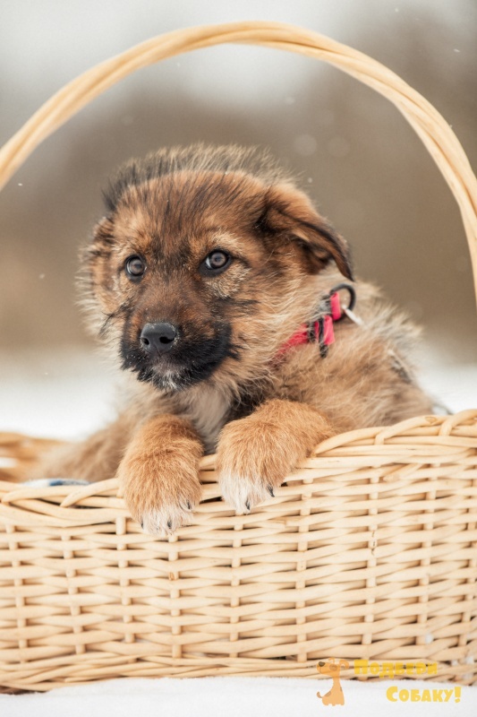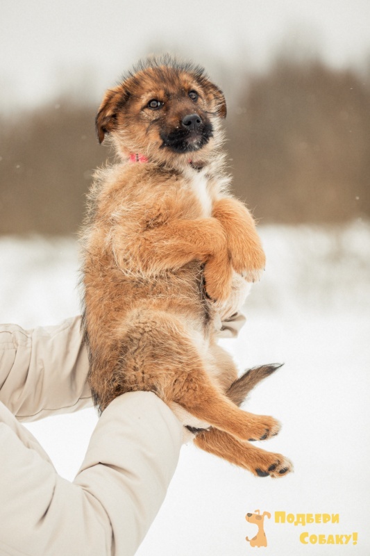 Познакомьтесь с Карамелькой - очаровательной трёхмесячной девочкой с нежным коричневым окрасом шерсти. Её пушистая головка украшена игривым щенячьим пушком, который придаёт ей особенно милый и забавный вид.